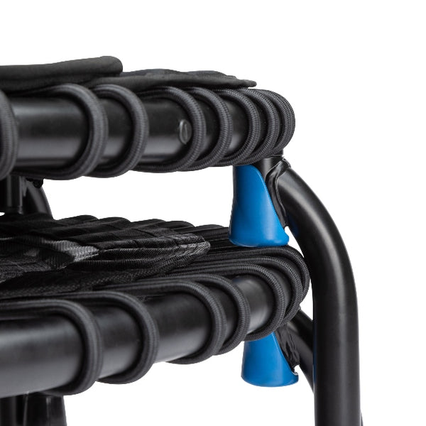 Easily adjustable and replaceable elastic bungee cords. Virtually silent bounce experience- perfect for group classes, with no squeaky springs or distractions.
