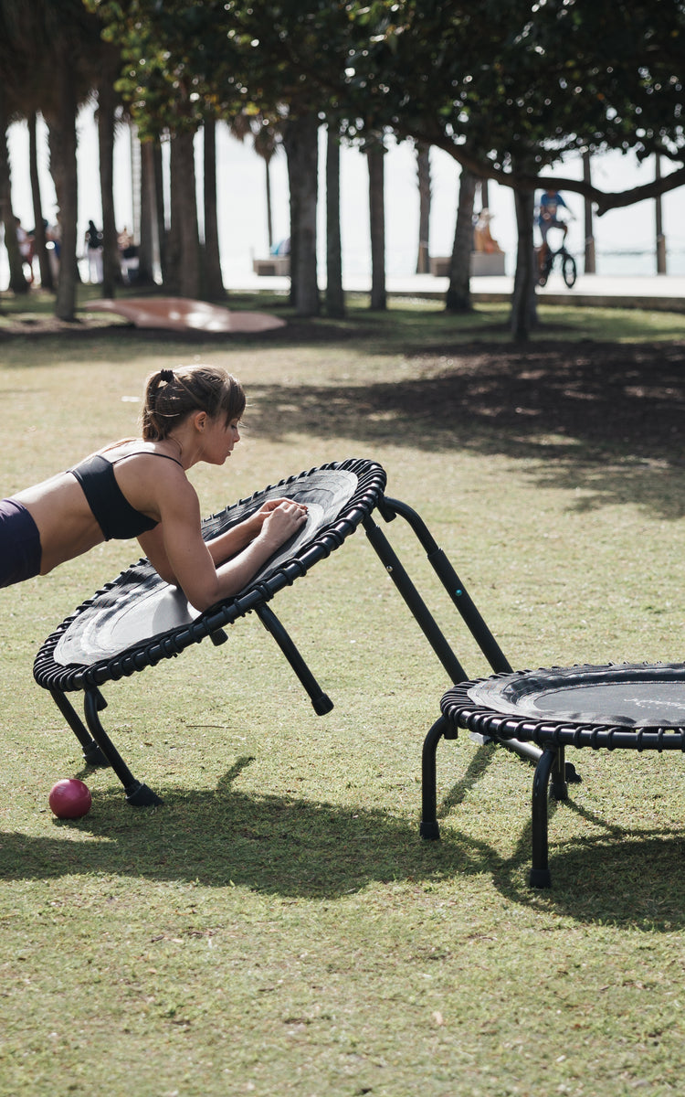 Our patented arched legs provide superior stability, preventing tipping when getting on or off the trampoline or during workouts. The unique design makes it safer for dynamic exercises and easy to stack, saving space in your studio or home gym.